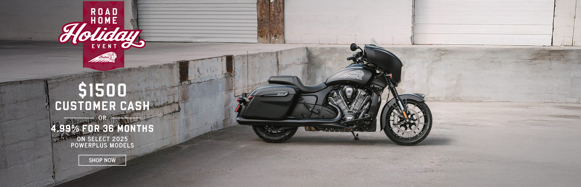This is a limited time offer which consists of $1,000 Customer Cash rebate towards the purchase of new model year 2025 Indian Challenger, Indian Pursuit, Chieftain, Chieftain PowerPlus Dark Horse, Roadmaster, or Indian Springfield models (excludes Elite models). This offer is subject to change and may be extended or terminated without further notice. Offer may not be combined with promotional financing offers. All rebates paid to dealer and are not redeemable for cash. Offer Valid: December 1 – 31, 2025.
